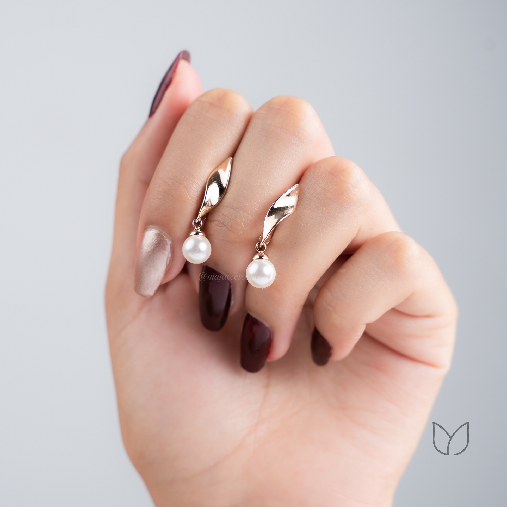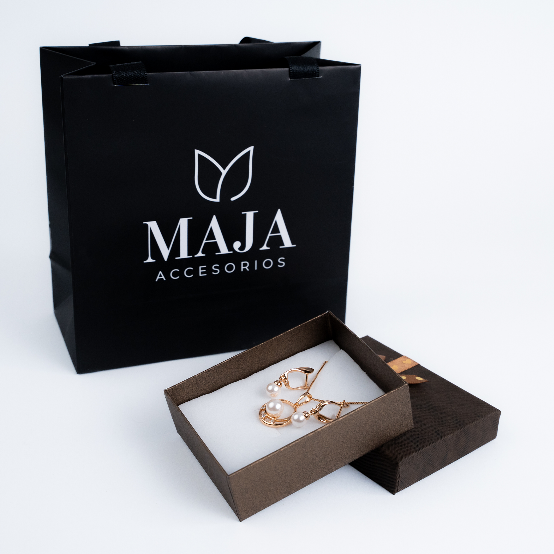 Su tono oro rosé y la perla central crean un brillo sutil que acompaña tanto looks diarios como ocasiones especiales. Es un set atemporal, ligero y fácil de combinar, ideal para quienes valoran los detalles finos.